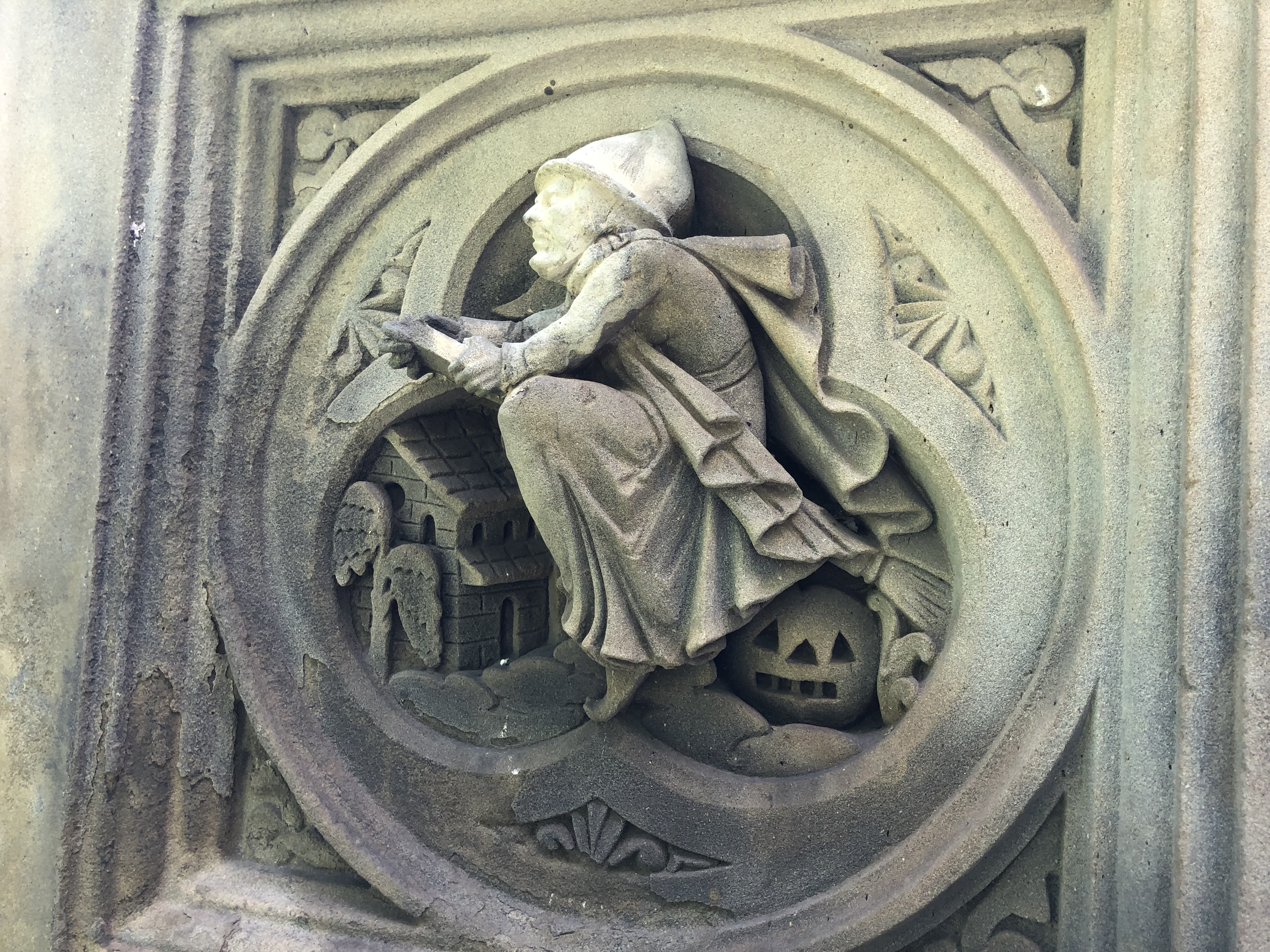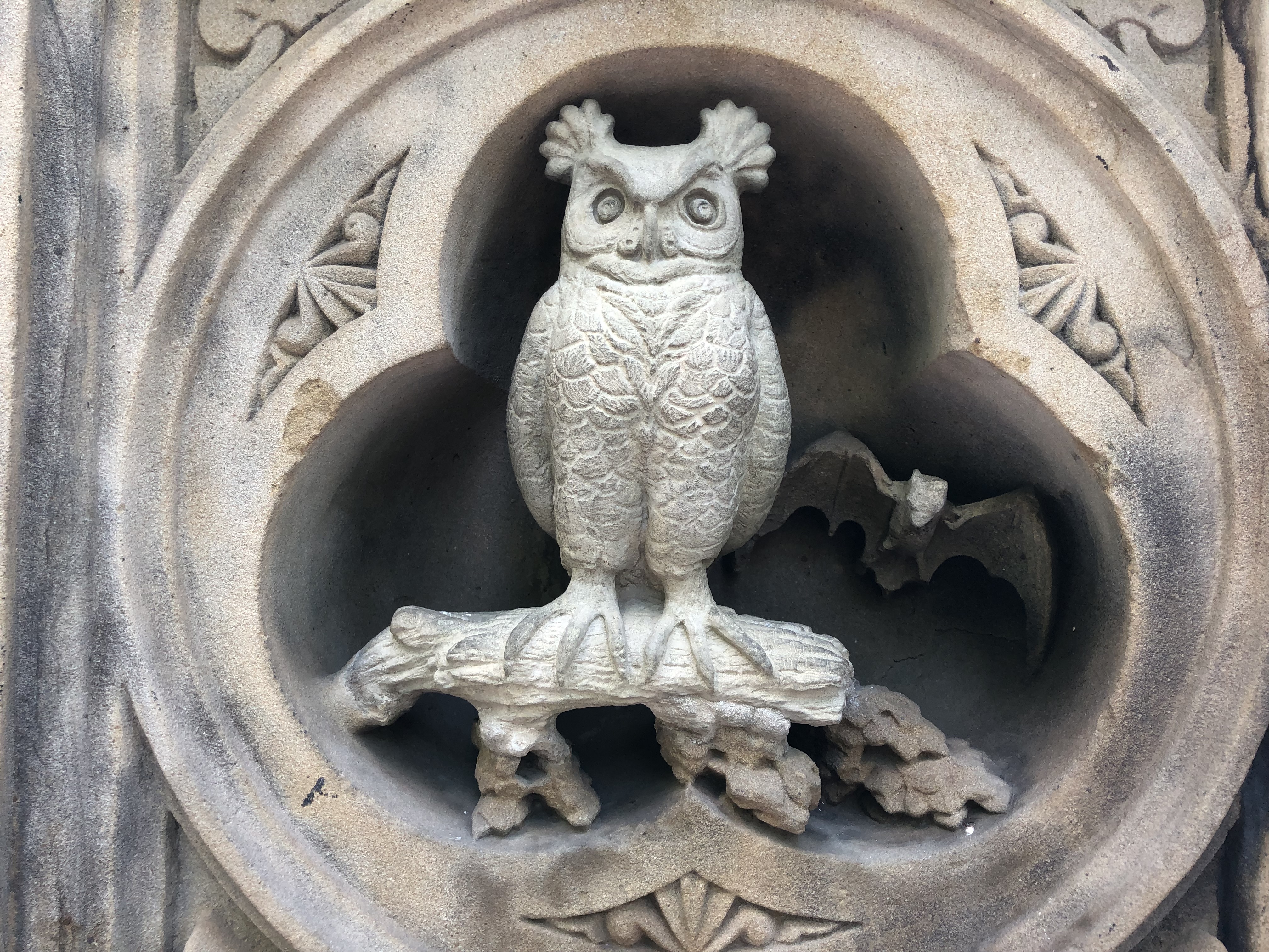 So look at the sculptures lining the stairs, and this is what you’ll find: A rooster and sunrise symbolize the morning. An owl and bat represent the night—along with an open book and a lantern to read by. Tulips and a bird’s nest bring us into spring, roses and an ear of corn into summer. A witch and pumpkin take us into fall. Are the pine cones for winter? What I love about these sculptures is that they are visual puzzles: whimsical and head-scratching and mysterious and beautiful. The Central Park Conservancy says the terrace is “rich with complex iconography,” and they are completely right.